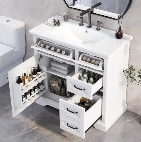 Modern 36-inch bathroom vanity with ceramic sink combo. Durable, stylish, and spacious design for a clutter-free, elegant bathroom upgrade. Featuring a smooth, easy-to-clean ceramic sink, sturdy cabinet construction, and ample storage for toiletries and essentials, this vanity is perfect for creating a sleek and functional bathroom space.
